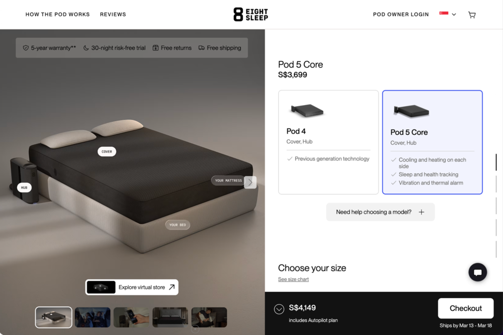 最新的 Pod 5 分三个版本。入门版 Pod 5 Core 大约 2849 美元一张 Queen 尺寸。中间档 Pod 5 Plus 加了一条液冷加重毯,12 磅重,连在床罩上,上下同时调温。顶配 Pod 5 Ultra 卖到 5849 到 6099 美元,带可调底座、内置环绕音响 ( 里面有神经科学家 Andrew Huberman 录制的 NSDR 放松内容 ),以及 Health Check 功能,能够做到 AI 驱动的心血管和呼吸异常检测。