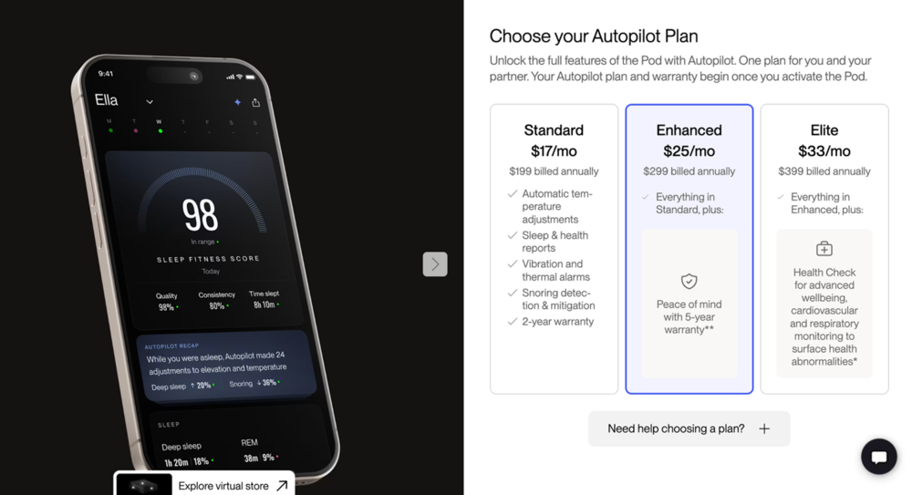 具体来说,你花 2849 到 6099 美元买了一台 Pod 之后,还必须订阅第一年的 Autopilot 服务。订阅分三档:Standard 每年 199 美元,Enhanced 每年 299 美元 ( 含 5 年延保 ),Elite 每年 399 美元 ( 含心血管和呼吸异常高级检测 )。第一年是强制的,之后自动续订,你可以取消。
