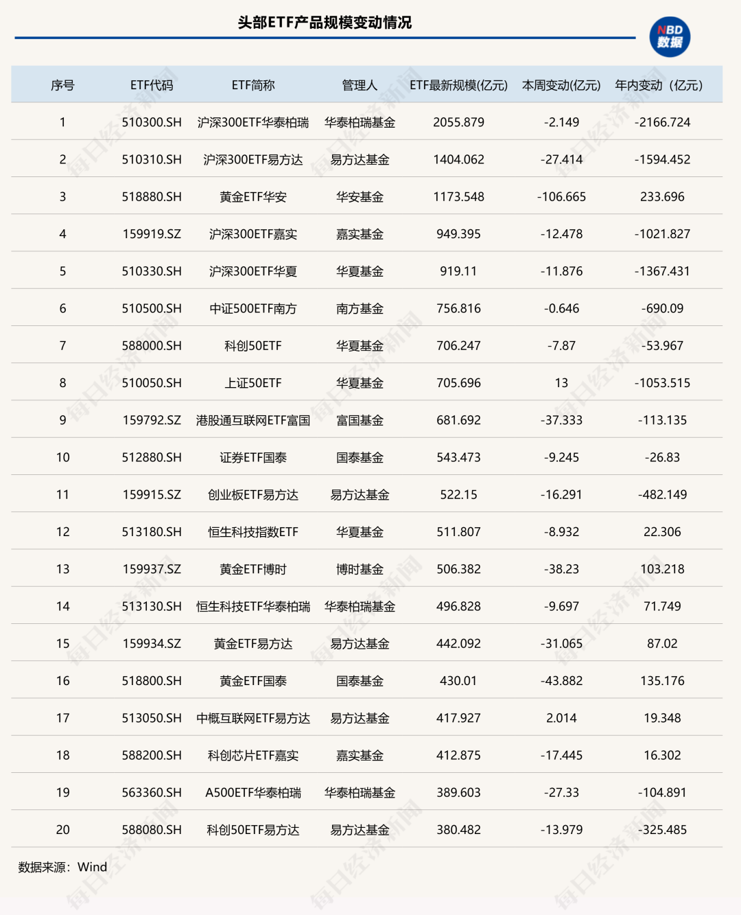 具体规模变动方面,华夏基金旗下上证50ETF和中概互联网ETF易方达分别增长13亿元和2.01亿元,成为TOP20产品中本周“唯二”实现规模正增长的ETF。