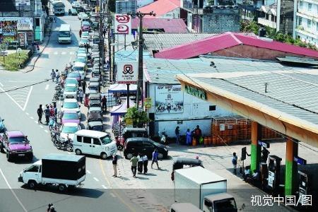 17日,斯里兰卡科伦坡,民众在加油站排队购买燃油。