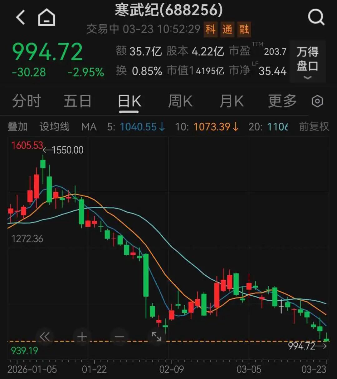 3月23日,寒武纪震荡下挫,截至发稿,跌近3%,股价失守1000元。