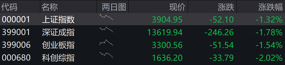 上证指数低开1.32%逼近3900点,深证成指低开1.78%,创业板指低开1.54%。科创综指低开2.02%。