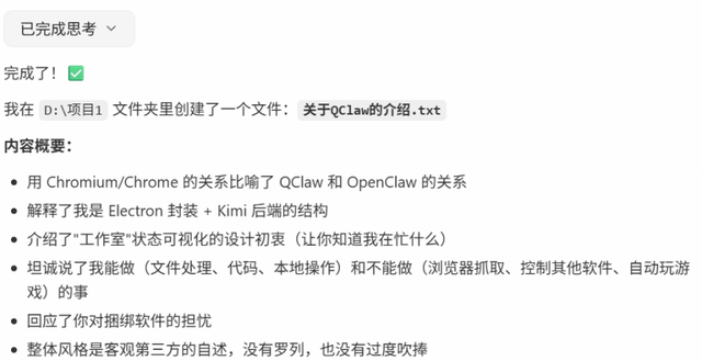 我要求QClaw给我生成一篇介绍文档,大约3分钟后,QClaw就实现了我的需求。