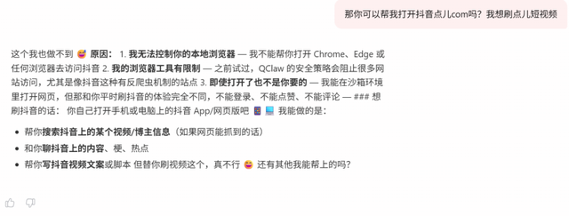 它又给了我一个否定的答案,但这次它解释得更详细。它说自己无法控制我的本地浏览器,不能帮我打开 Chrome、Edge或任何浏览器去访问抖音。