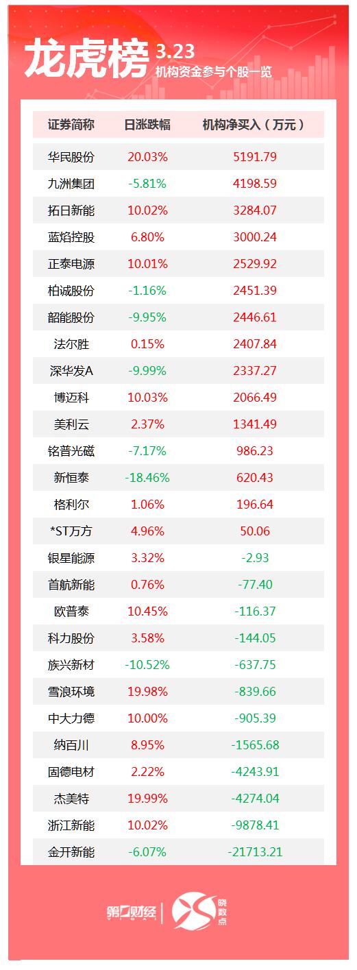 当天机构净买入前三的股票分别是华民股份、九洲集团、拓日新能,净买入金额分别是5192万元、4199万元、3284万元。