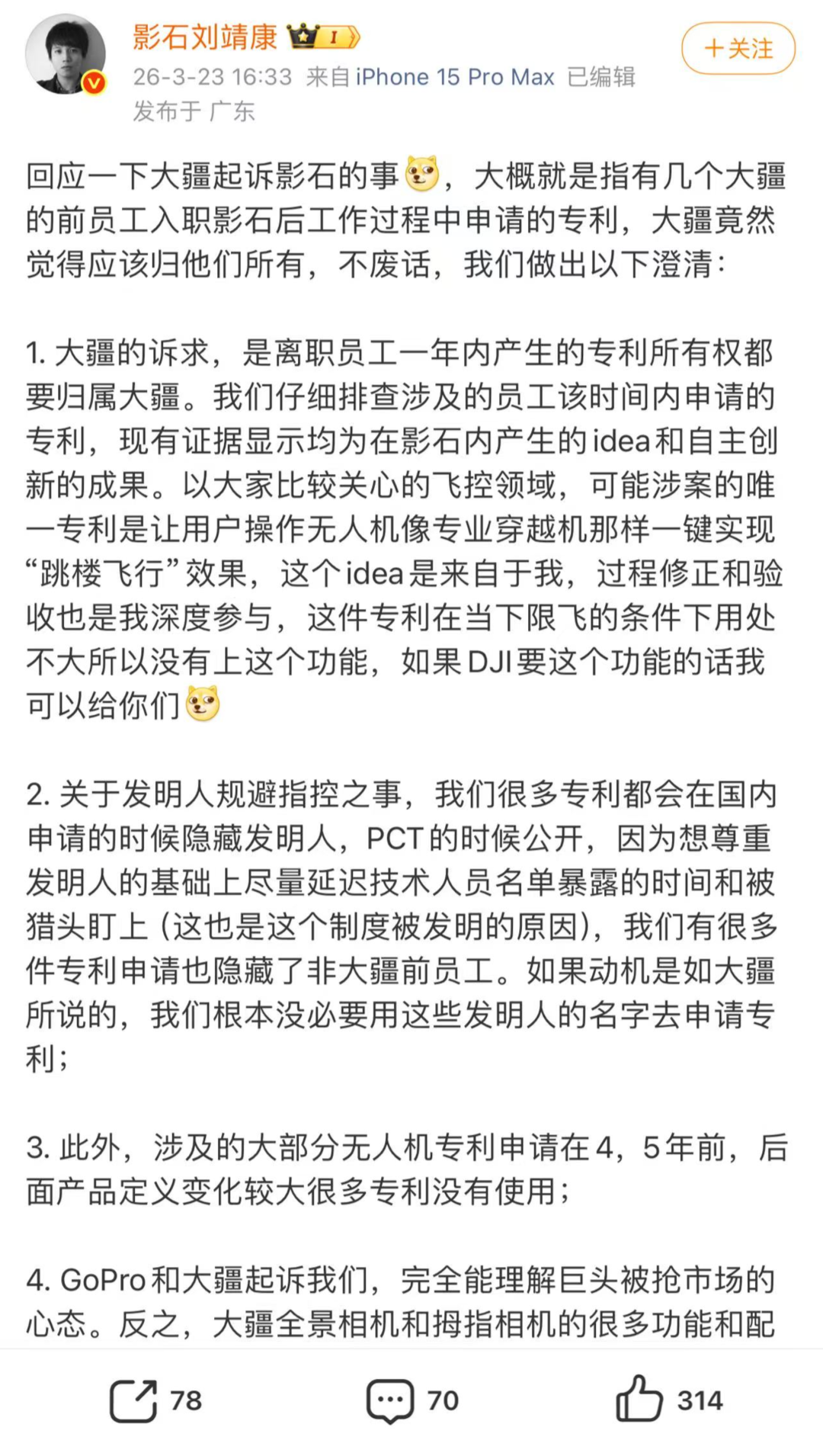 3月23日,影石创新创始人刘靖康在社交平台就此事做出回应。刘靖康表示,“大疆的诉求,是离职员工一年内产生的专利所有权都要归属大疆。我们仔细排查涉及的员工该时间内申请的专利,现有证据显示均为在影石内产生的idea和自主创新的成果。”