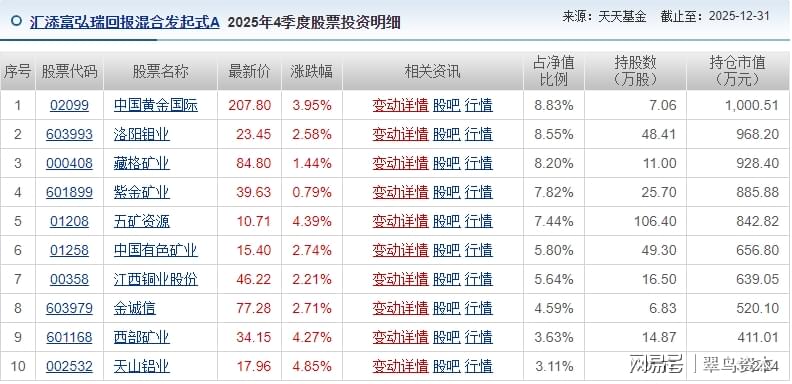 截至2025年四季度末,弘瑞回报的前十大重仓股分别为中国黄金国际、洛阳钼业、藏歌矿业、紫金矿业、五矿资源、中国有色矿业、江西铜业股份、金诚信、西部矿业、天山铝业,合计持仓占比为63.61%;债券持仓中,前五大持仓分别为23国债21、22国债26、24中证G3、中证G3、鄂交YK03,合计持仓占比为18.48%。可以看出,该基金的股票持仓明显集中在有色金属行业,风格相对激进,与陈思行的固收背景并不相符,侧面验证了陈思行在该产品中担任的角色是守,而非进攻。