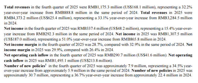 2025年,元保实现营业收入43.73亿元,同比增长33.1%,且季度增长稳健,第四季度单季营收11.75亿元,同比增长32.2%;利润表现更为抢眼,13.08亿元的净利润,同比飙升51%,远超营收增速,带动净利润率从2024年的26.4%跃升至29.9%。