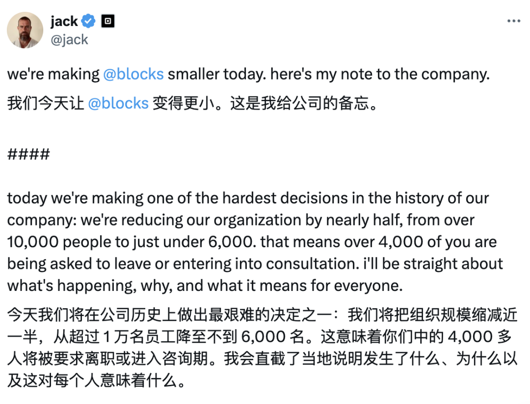 最先点燃导火索的是Block。2月26日,Block创始人Jack Dorsey宣布裁员4000人,直接砍掉公司近一半的员工。