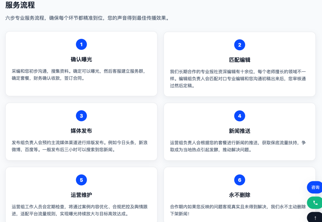 公司会在规定时间内完成推流服务,并负责后续维护,“直到您的问题得到有效处理,事情不处理,新闻不下架。”当被问及维权成功率时,对方称“70%都能成功”。