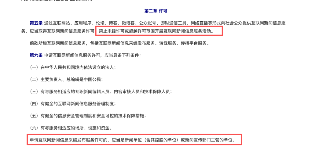 《互联网新闻信息服务管理规定》 明确规定,通过互联网站、应用程序、论坛、博客、微博客、公众账号、即时通信工具、网络直播等形式向社会公众提供互联网新闻信息服务,应当取得互联网新闻信息服务许可,禁止未经许可或超越许可范围开展互联网新闻信息服务活动。
