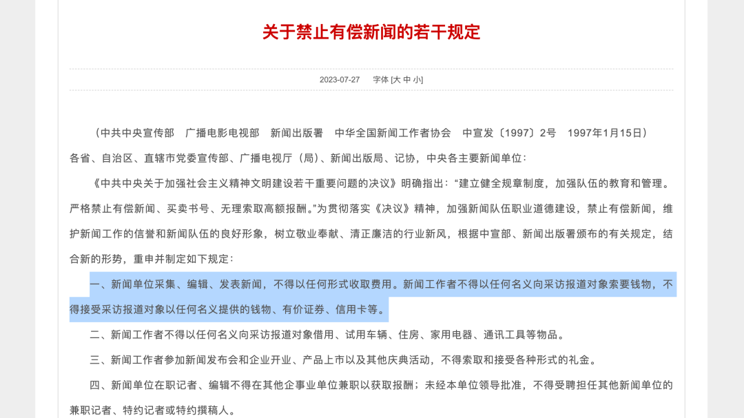 此外,中宣部等多部门发布的《关于禁止有偿新闻的若干规定》中明确提到,新闻工作者不得以任何名义向采访报道对象索要钱物,不得接受采访报道对象以任何名义提供的钱物、有价证券、信用卡等。