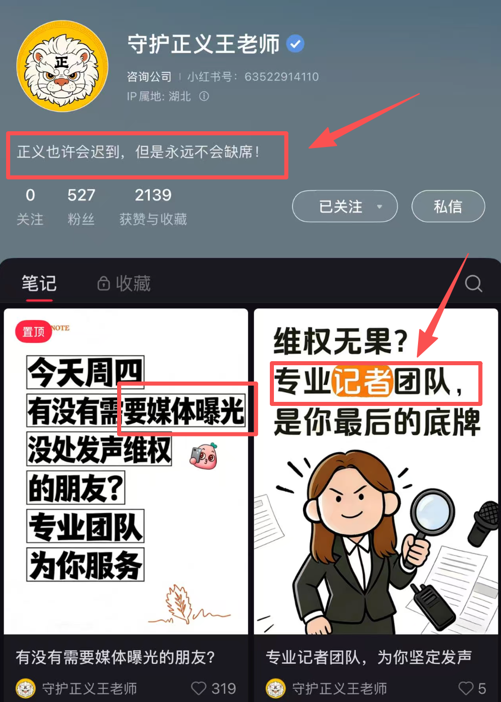 社交媒体上,一个名为“守护正义王老师”的账号正在活跃运营着。账号签名写着:“正义也许会迟到,但永远不会缺席”。