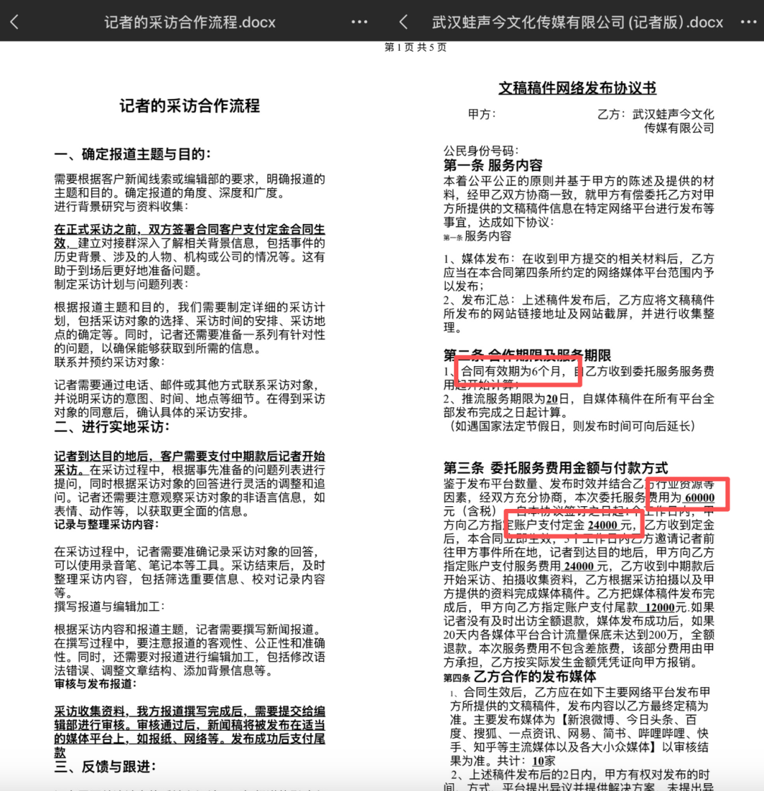 对方介绍,选定曝光方案后先签订合同,支付40%定金,随即建群对接,安排专业编辑老师一对一撰写新闻稿;定稿后再付40%中期款,待稿件发布成功,支付20%尾款。