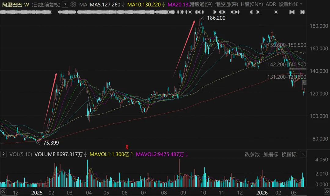以上几个事件,又让阿里巴巴股价从8月底的115港元附近一路单边暴涨到10月初的186港元。
