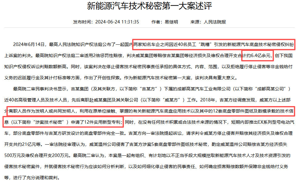 再比如两年前公布的威马汽车和吉利集团的案件,当时吉利旗下子公司的40名高管及技术人员离职跳槽去了威马。