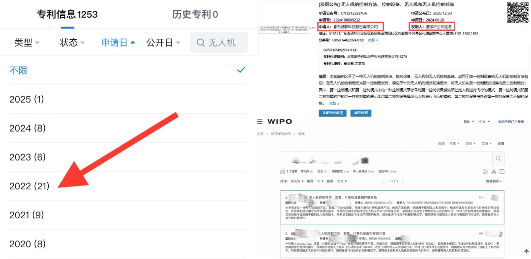 疑点在于,大疆是做无人机起家,而影石关于“无人机 ” 的相关专利,接近一半都在2022年申请。