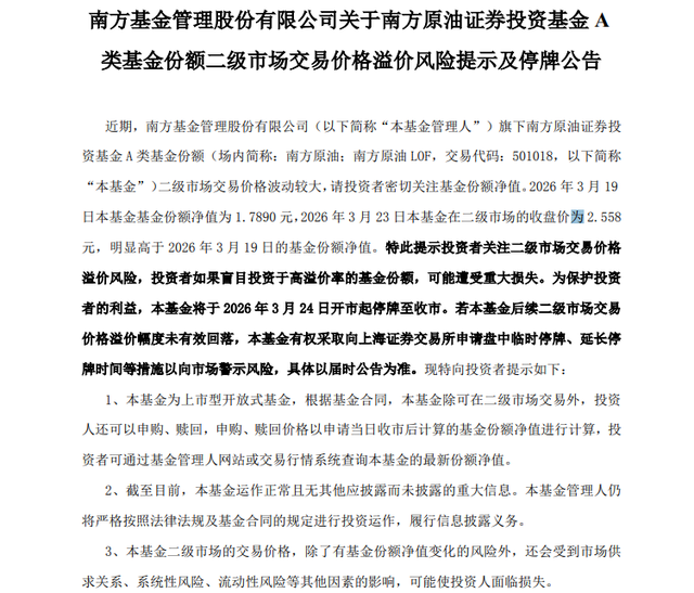 数据提示了问题的严重性。3月23日晚间,原油LOF易方达和嘉实原油LOF晚间发布公告称,3月24日-10:30临时停牌,警示溢价风险,复牌后若溢价未回落,将采取进一步措施。