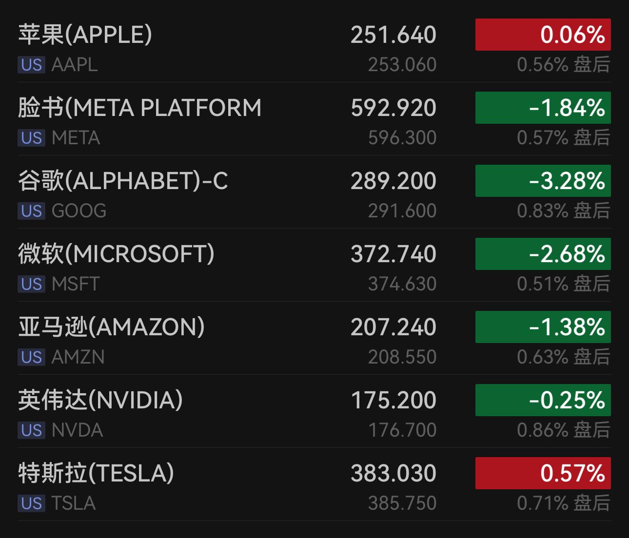 大型科技股走势分化。特斯拉上涨0.57%,苹果上涨0.06%,超威半导体上涨1.33%。英伟达下跌0.25%,微软下跌2.68%,亚马逊下跌1.38%,Meta Platforms下跌1.84%,博通下跌1.31%;Alphabet方面,谷歌A类股下跌3.85%,C类股下跌3.28%。