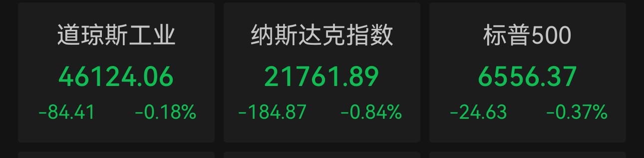 截至收盘,主要股指集体下跌,回吐周一部分涨幅。道琼斯工业平均指数下跌84.41点,收于46124.06点,跌幅为0.18%;标准普尔500种股票指数下跌24.63点,收于6556.37点,跌幅为0.37%;纳斯达克综合指数下跌184.87点,收于21761.89点,跌幅为0.84%。