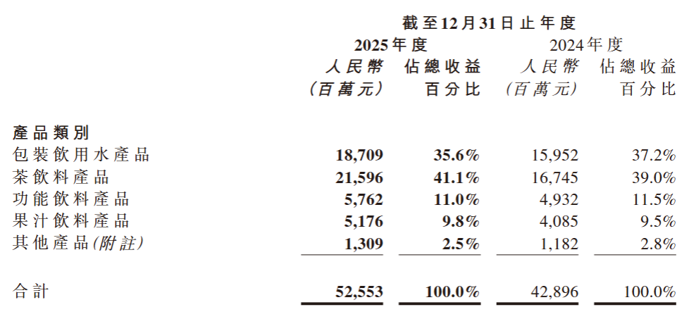 2025年农夫山泉包装饮用水营收187.09亿元,同比增长17.3%,占总收入的35.6%,较2024年37.2%的占比下滑。