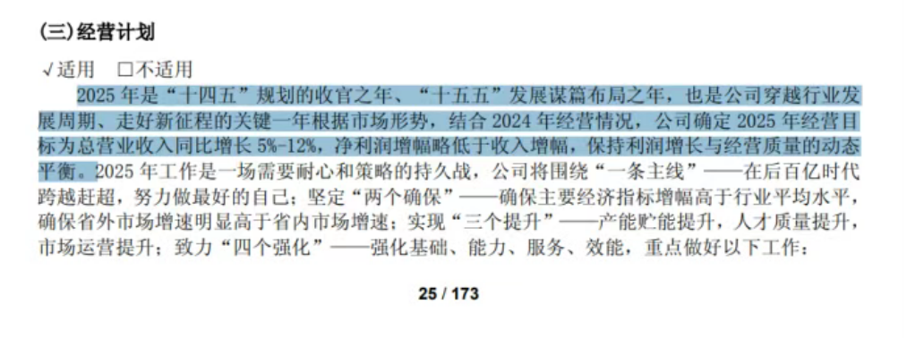 进入2025年,公司曾在2024年年报中明确提出:“结合2024年经营情况,公司确定2025年经营日标为总营业收入同比增长5%-12%,净利润增幅略低于收入增幅,保持利润增长与经营质量的动态平衡”,但从前三季度营收同比下降超10%的表现来看,今世缘2025年全年业绩要实现与上年持平都不易,增长更是几乎没有可能。连续两年完不成经营计划,不仅打击市场信心,更暴露出公司在战略执行与市场预判上的偏差。