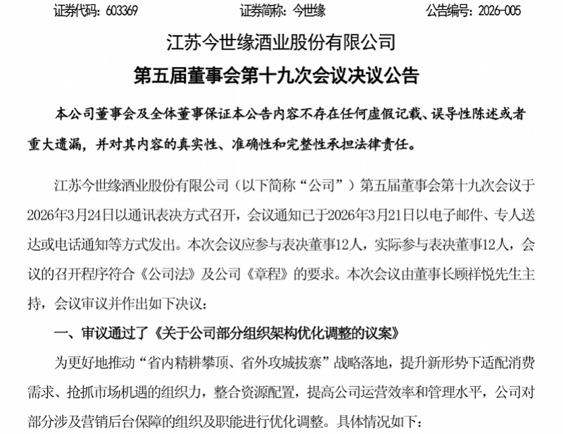 3月24日晚,今世缘发布第五届董事会第十九次会议决议公告,审议通过了《关于公司部分组织架构优化调整的议案》。公司宣布新成立品牌传播管理部、数字化营销中心,并对文化部、销售部等多个核心部门的职能进行深度调整。这距离其2025年的大规模组织重整,仅仅过去了一年时间。