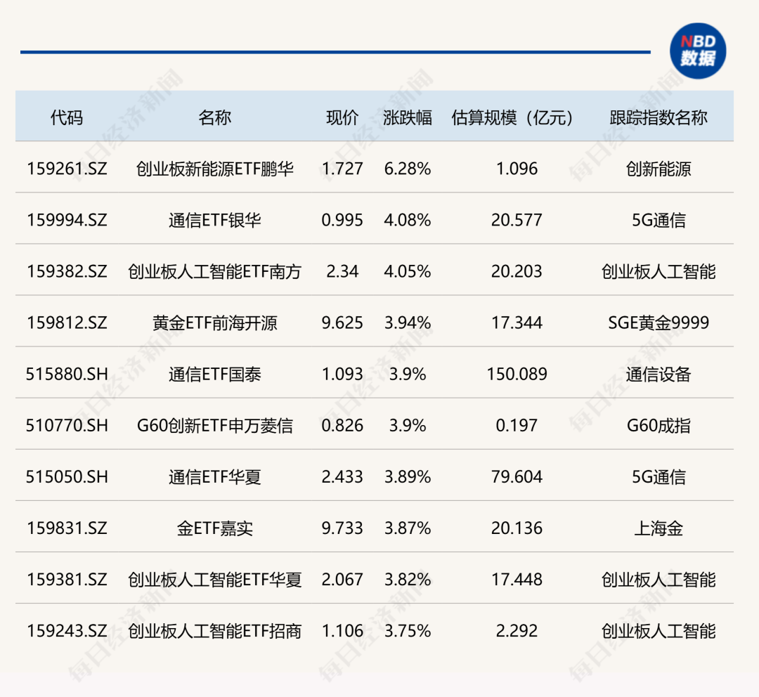 ETF涨跌幅方面,创业板新能源ETF鹏华涨超6%,通信、人工智能相关ETF涨约4%。