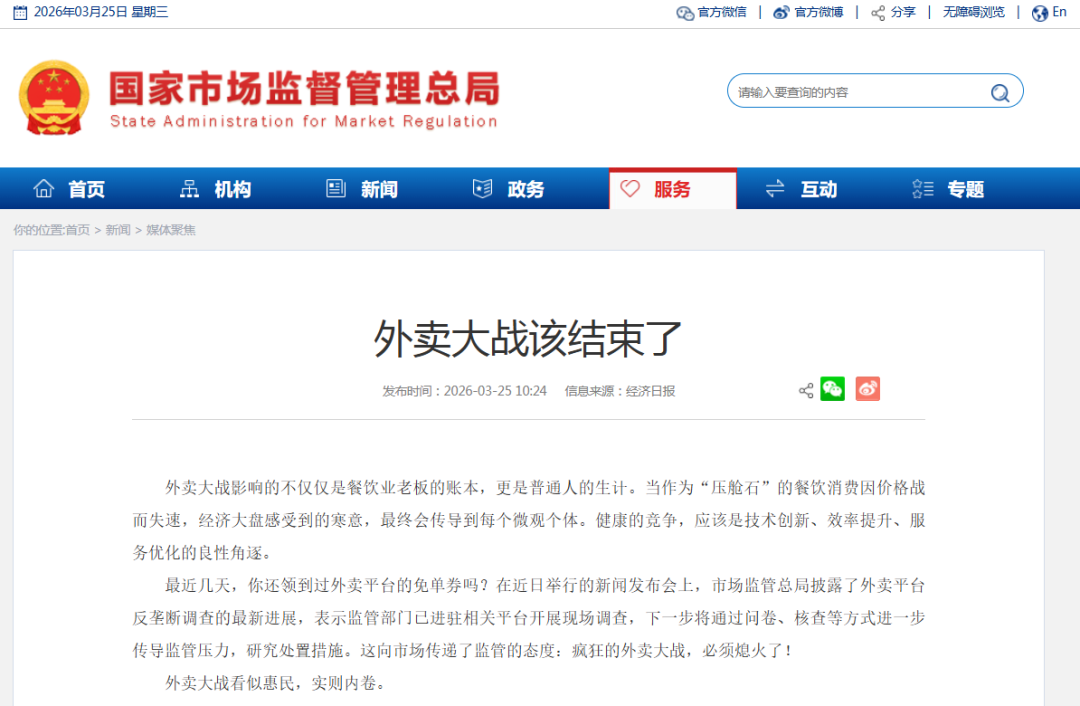 当日上午,国家市场监督管理总局官网转载了经济日报《外卖大战该结束了》一文。