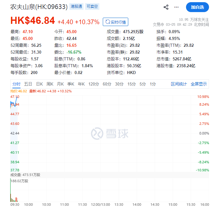 这不,昨晚农夫山泉刚发了2025年财报。 今天一开盘, 就直接拉了10个点。
