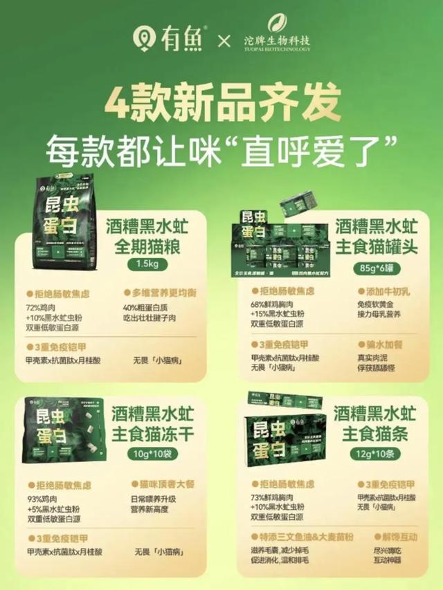 2025年10月,四川沱牌生物科技有限公司就与宠物品牌有鱼达成战略合作,联合发布了全国首款“酒糟黑水虻昆虫蛋白产品线”,推出了以舍得鲜酒糟培育黑水虻为核心原料的“极净虫膳”系列宠粮,落地商业化销售。