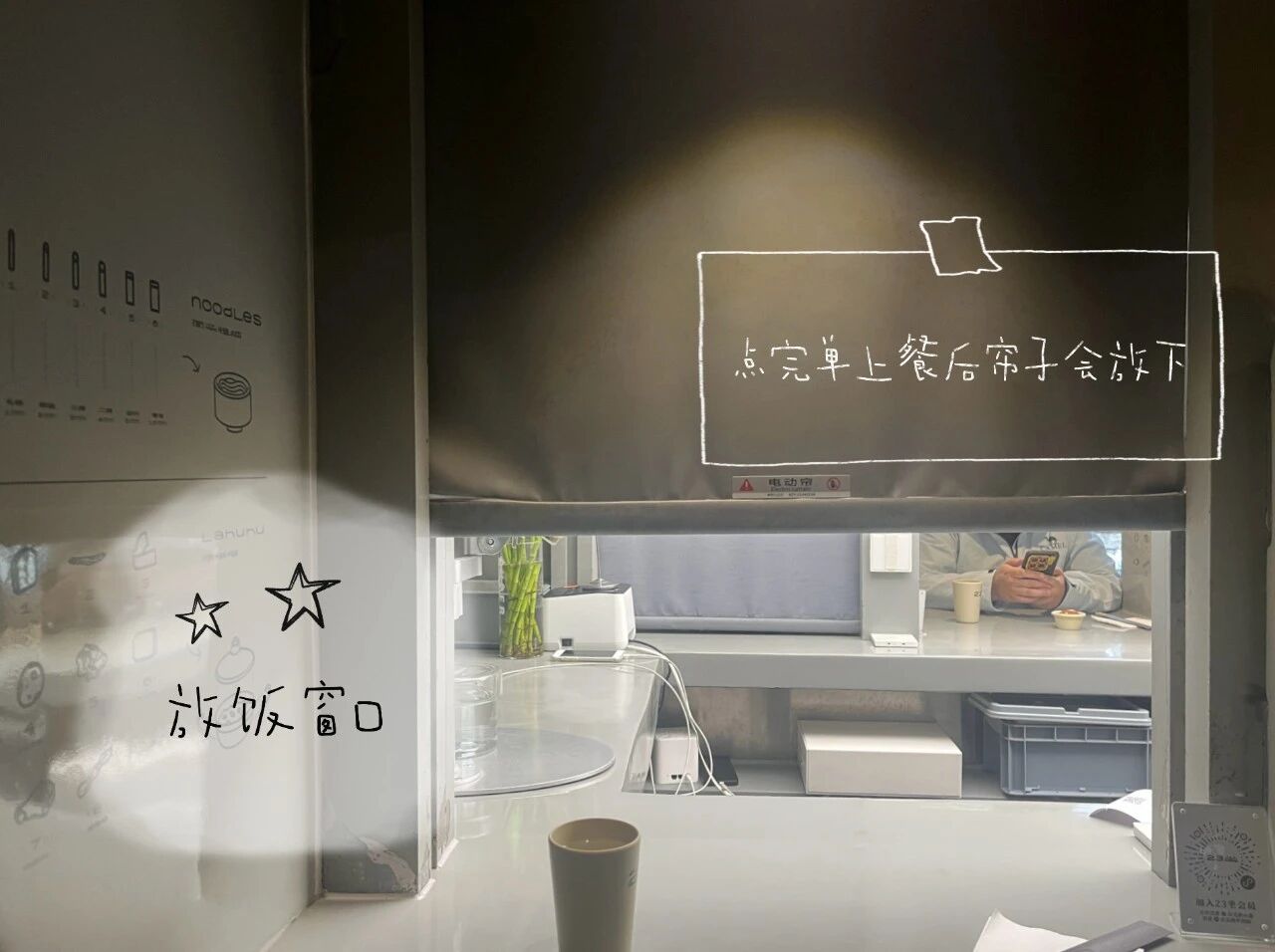 放饭的时候,帘子会打开一半,服务员将面碗从对面递上,你甚至看不见她的头,之后帘子又会放下来,留你和你的面安静地呆着——乍一看,真的很难第一时间判断这是餐厅,还是监狱。
