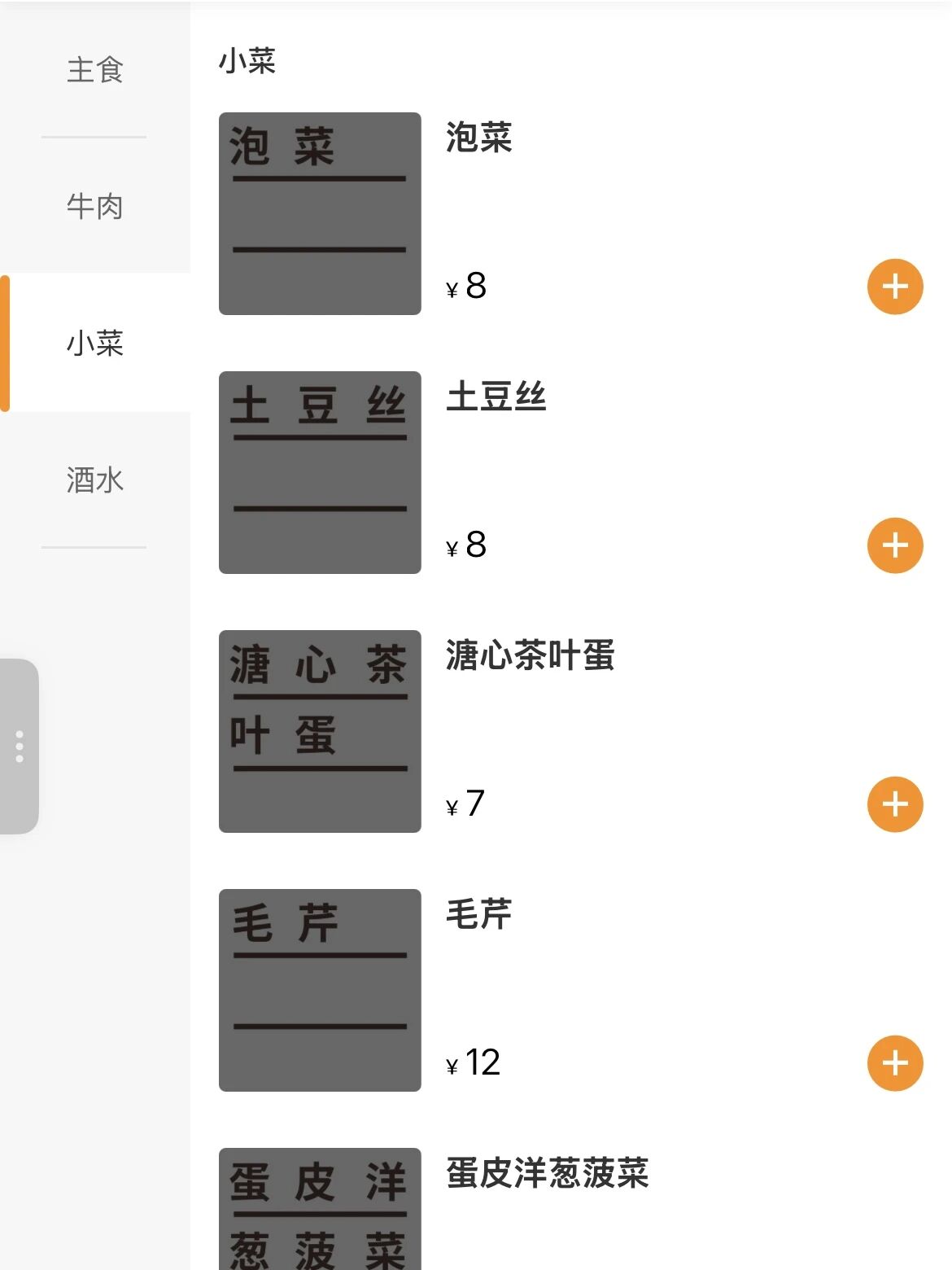 打开小程序,发现极简的装修一样,它也拥有着极简的SKU,不过四种主食、两种牛肉、七种小菜和五种饮品,而且,菜单上并没有图片,只有文字描述,神秘兮兮的,吃什么全靠想象。