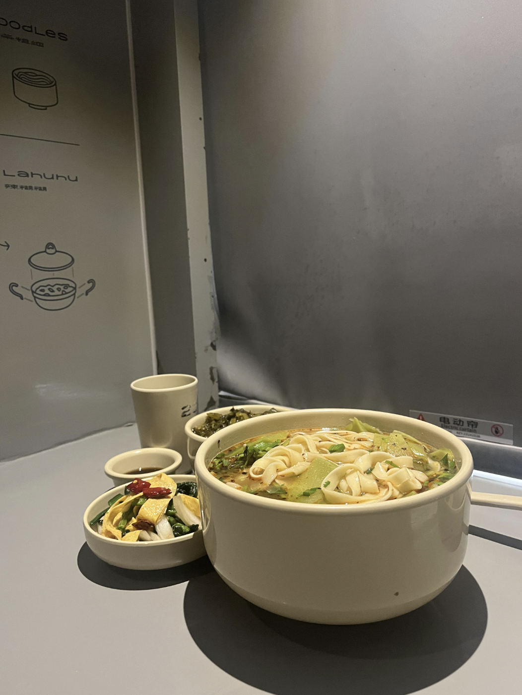 虽然装修很高冷,但吃的却很接地气,招牌是一碗兰州牛肉面。和普通兰州拉面店不同的是,饮料的价格快赶上了主食,你可以选择一边吃28元的兰州拉面,一边喝23元的可尔必思。