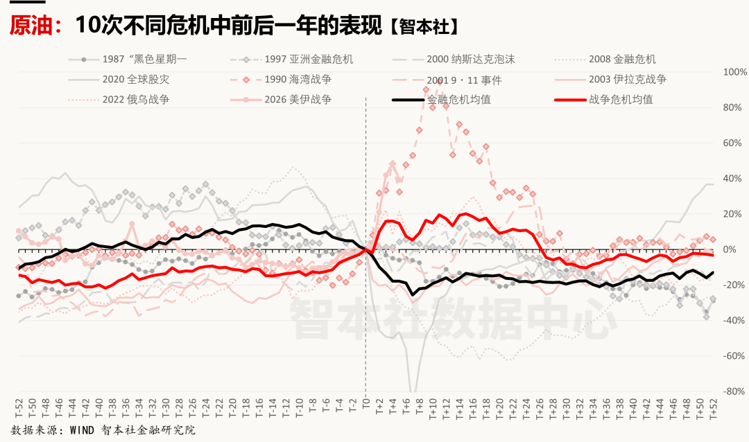 黄金:在不同危机中,黄金的表现呈现明显的分化;在战争危机中的避险属性强于金融危机,战争危机均值高于金融危机均值,并在危机爆发后一年内赢得接近10%的涨幅;在金融危机中的表现堪忧,均值在前三月甚至明显下跌、暴露风险特性,而且价格在不同金融危机中的走势差异巨大。