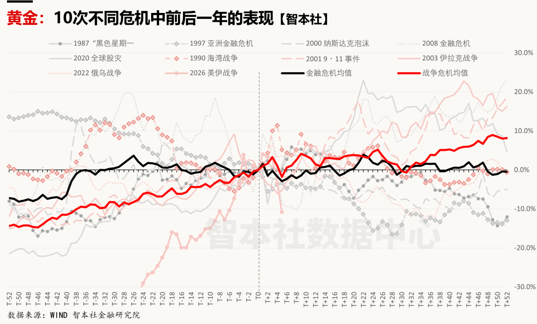 二、“乱世黄金,充满陷阱”;黄金在不同危机中的表现明显分化,战争危机均值高于金融危机均值;在战争危机中展现避险资产本色,战争危机均值在一年内赢得接近10%的涨幅;但是,在当下的美伊战争中,黄金从“避险资产”大逆转为“风险资产”;黄金在金融危机中的表现堪忧,均值在前三月明显下跌、暴露风险特性,而且在五次金融危机样本中价格走势混乱。