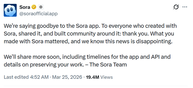 凌晨的时候Sora官方发了一条告别声明,“我们要和Sora App说再见了。”