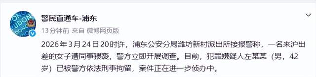 3月25日晚,上海市公安局浦东分局官方微博@警民直通车-浦东发布通报称,3月24日20时许,浦东公安分局潍坊新村派出所接报警称,一名来沪出差的女子遭同事猥亵,警方立即开展调查。目前犯罪嫌疑人左某某(男,42岁)已被警方依法刑事拘留,案件正在进一步侦办中。