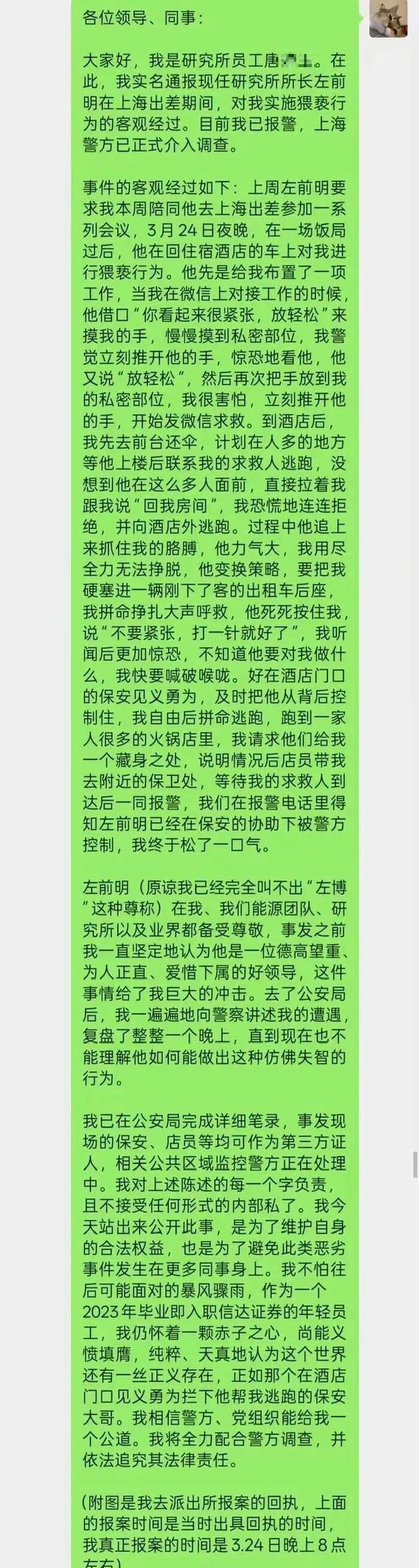 据网传内容,举报人在微信工作群中发了一段说明,内容包括:“上周左前明要求我本周陪同他去上海出差参加一系列会议,3月24日夜晚,在一场饭局过后,他在回住宿酒店的车上对我进行猥亵行为......”万幸酒店保安出手控制。