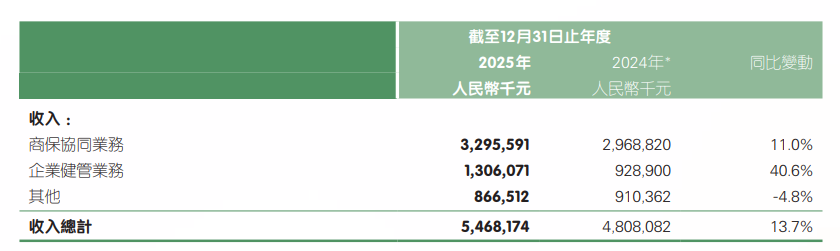 平安好医生当前的业务主要是为用户提供一站式医疗健康养老解决方案,可分为商保协同和企业健管两大业务板块。从财报来看,商保协同业务(F端)录得收入32.96亿元,同比增长11%;企业健康管理业务(B端)录得收入13.06亿元,同比增长40.6%,营收占比同比提升4.6个百分点至23.9%。 在企业健康管理业务方面,截至目前服务企业客户数突破6700家,同比增长83.1%。同时,该业务2025年带来约36.3亿元GMV。