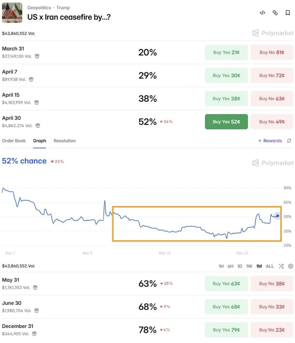 据Axios报道,美国与多个地区斡旋方正在讨论最快于本周四与伊朗举行高级别和平谈判的可能性,但目前仍在等待德黑兰的回应。预测市场目前显示,4月底前达成停火协议的概率约为50%。