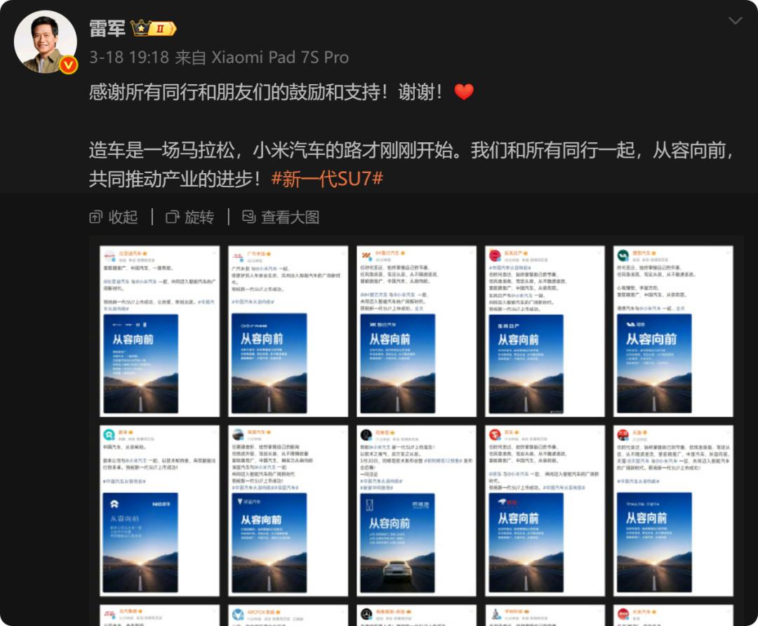 小米汽车SU7的发布,无疑是中国新能源汽车市场的一枚重磅炸弹。然而,在这场产品大秀之外,雷军通过一条微博晒出的15家车企及供应链巨头的祝福海报,以及发布会现场星光熠熠的合影,构成了另一场更为深远的行业事件。从比亚迪、蔚来到奔驰、理想,再到京东、阿里,这张几乎涵盖中国汽车与科技圈顶级力量的“全家福”,不仅彰显了雷军深厚的行业人脉,更在客观上为小米汽车节省了巨额的营销费用,完成了一次高维度的品牌背书。