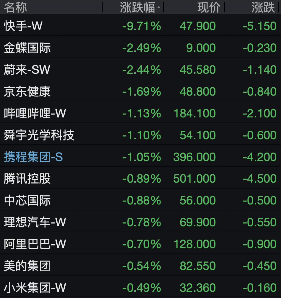 科网股多数下跌,快手跌近10%,金蝶国际、蔚来跌超2%,携程集团、腾讯控股、中芯国际、理想汽车、小米集团等均下跌。