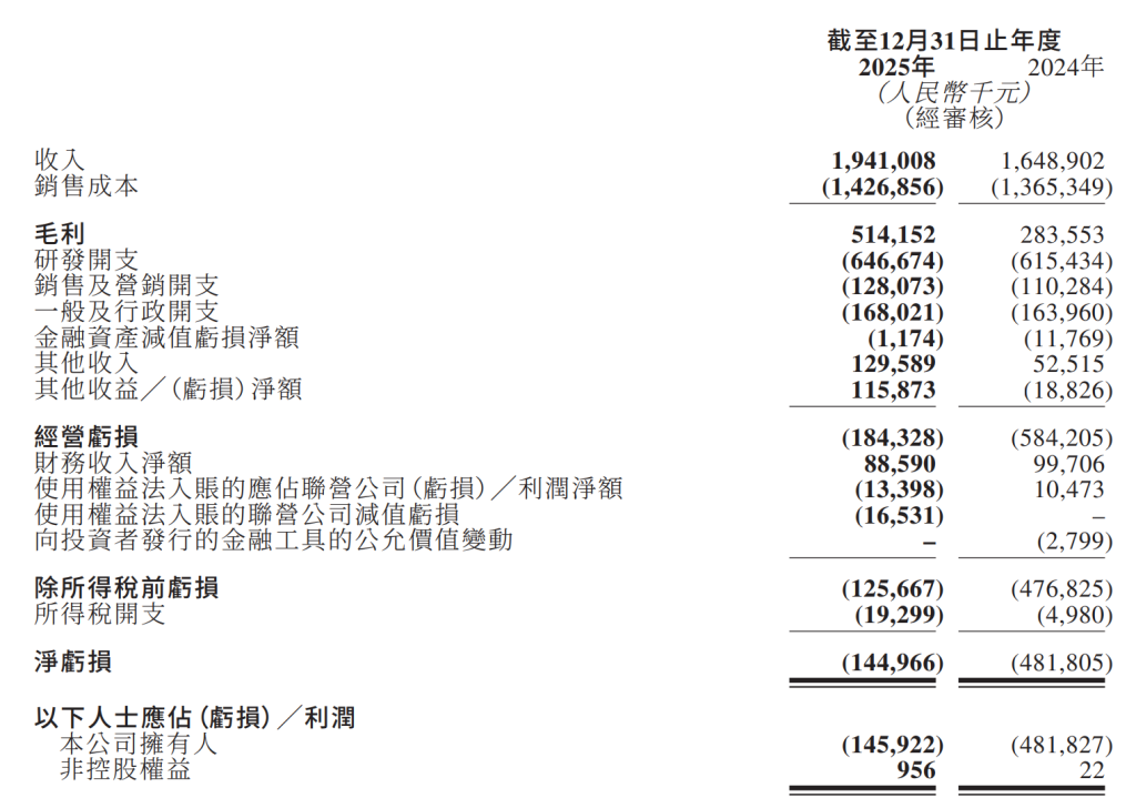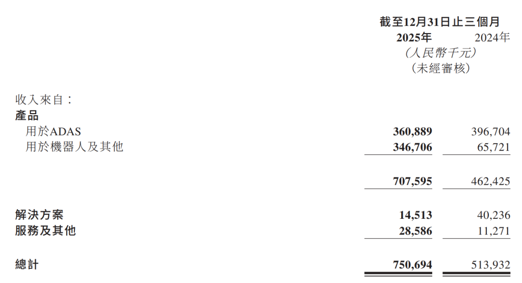 2025年,速腾聚创的激光雷达产品、用于ADAS(高级驾驶辅助系统)应用的激光雷达产品及用于机器人及其他的激光雷达产品的销量分别约为91.2万台、60.9万台及30.3万台,同比分别增加67.6%、17.2%及1141.8%。此外,其他收入由2024年的5252万元增加至2025年的1.3亿元,速腾聚创表示主要是由于2025年政府补助及利息收入增加,以及自一名客户收取了一次性现金赔偿。