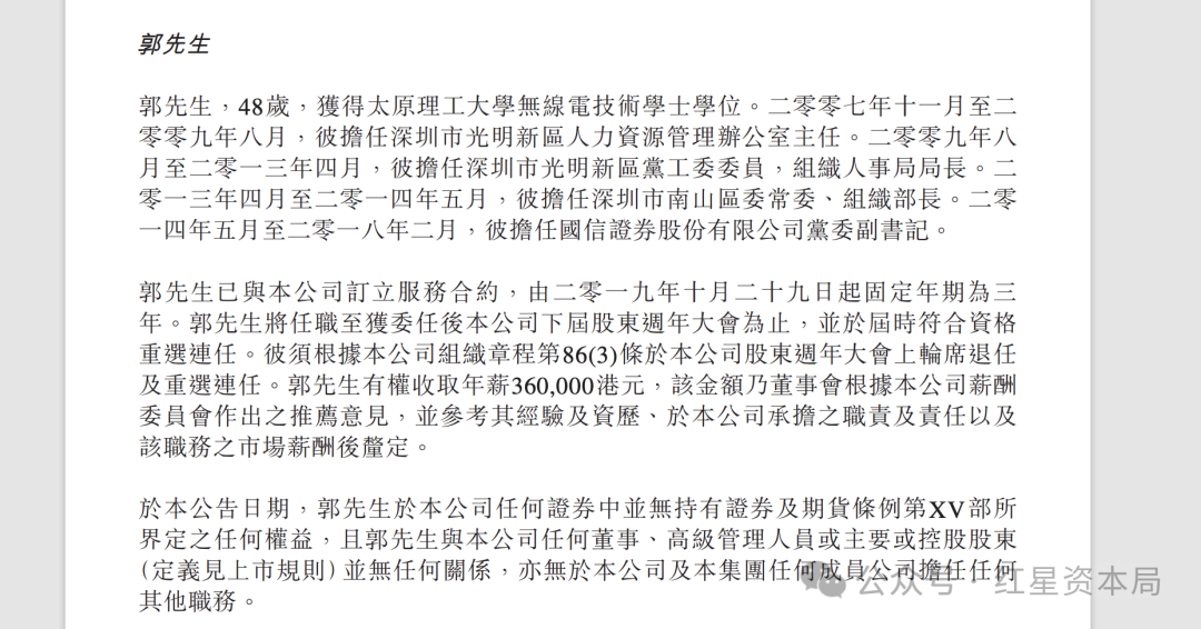 据酷派集团此前公告,郭敬晖早年曾在政府部门任职。郭敬晖获得太原理工大学无线电技术学士学位。2007年至2009年,担任深圳市光明新区人力资源管理办公室主任。2009年至2013年,担任深圳市光明新区党工委委员,组织人事局局长。2013年至2014年,担任深圳市南山区委常委、组织部长。2014年至2018年,担任国信证券股份有限公司党委副书记。