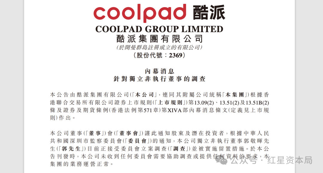 红星资本局3月26日消息,3月25日,酷派集团(02369.HK)发布关于独立非执行董事的调查信息,公告称,公司独立非执行董事郭敬晖正接受深圳市监察委员会立案调查并被实施留置措施。