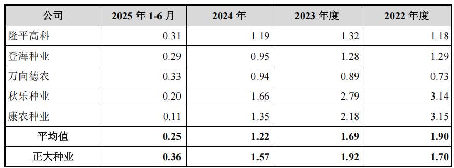 正大种业是一家主要从事玉米种子研发、生产、销售的“育繁推一体化”种子企业。2022年-2025年1-6月,公司营业收入分别为3.187亿元、4.089亿元、3.804亿元和8955.04万元,净利润分别为9469.4万元、8843.16万元、8113.31万元和1194.12万元;2023年和2024年净利润较2022年连续下跌,此外公司2025年实现营业收入3.609亿元,较上年下降5.12%。