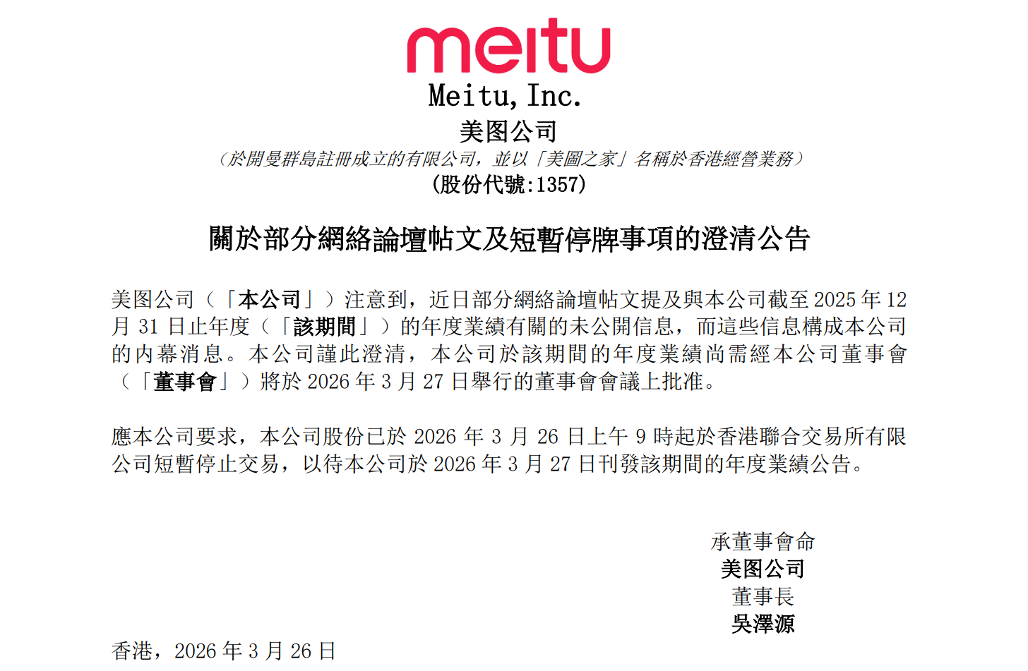 随后,美图公司发布澄清公告称,公司注意到,近日部分网络论坛帖文提及与公司截至2025年12月31日止年度业绩有关的未公开信息,而这些信息构成公司的内幕消息。谨此澄清,公司于该期间的年度业绩尚需经公司董事会将于2026年3月27日举行的董事会会议上批准。