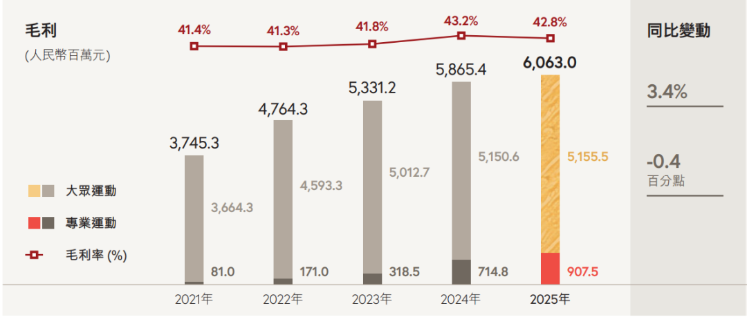 相比之下,大众运动分部的毛利仅增长0.1%,但毛利率下滑幅度轻微,从2024年的41.8%降至2025年的41.2%。