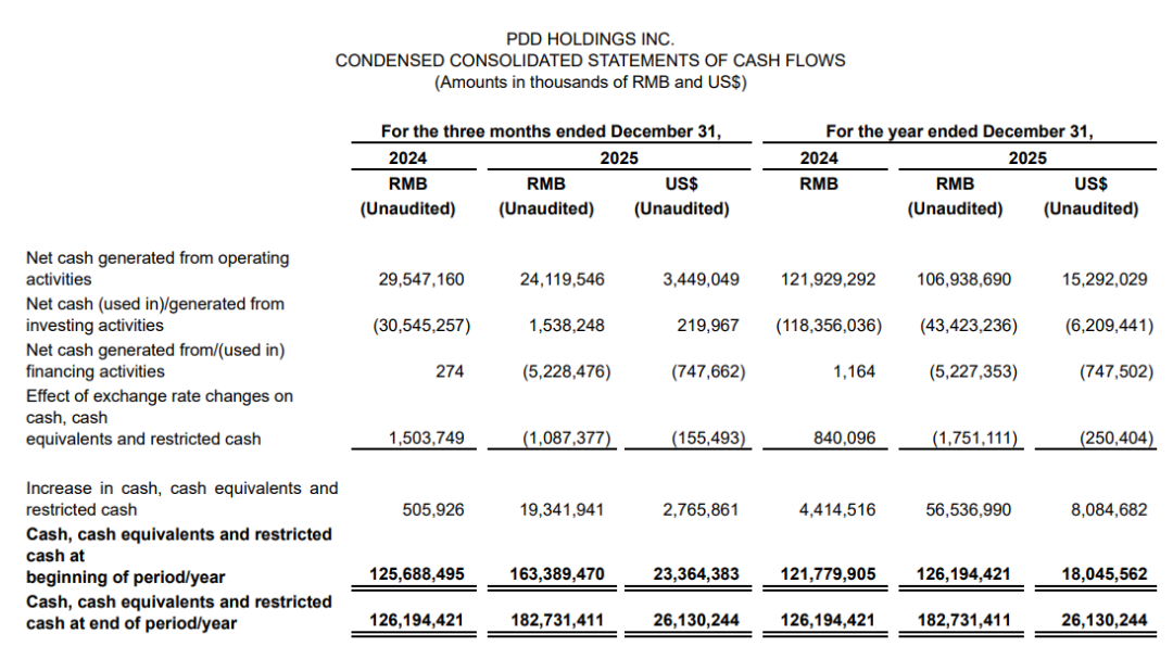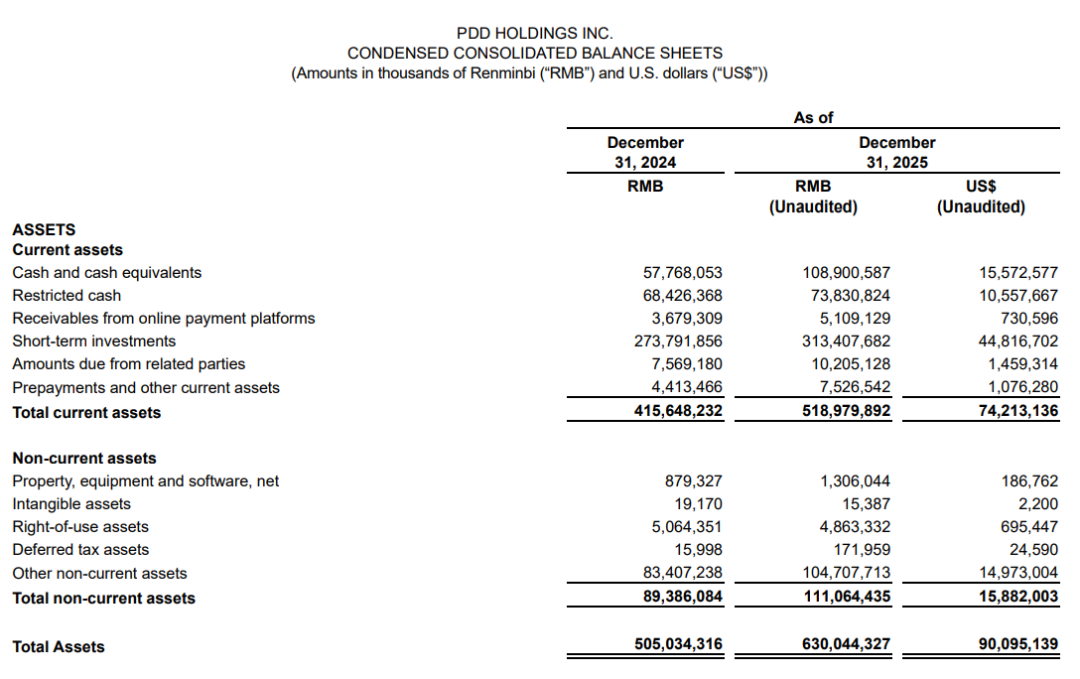 截至2025年底,拼多多账上的现金、现金等价物和短期投资从3316亿元增至4223亿元,增长了27%。